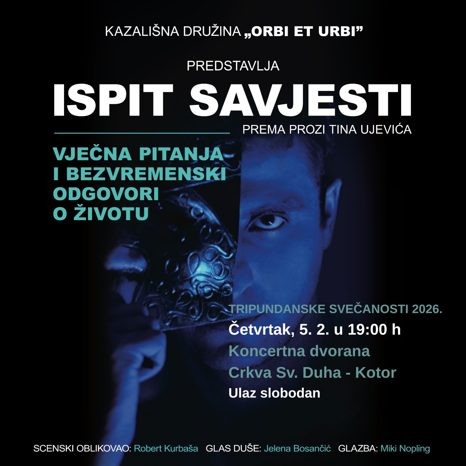 U okviru Tripundanskih svečanosti, u četvrtak, 5. 2. 2026., u 19.00 sati u ‘Koncertnoj dvorani – crkvi Sv. Duha’, bit će izvedena monodrama glumca Roberta Kurbaše: Ispit savjesti. Predstava se dotiče svevremenih tema, propituje i današnje društvo i u njemu čovjeka sa svim njegovim upitima i previranjima.