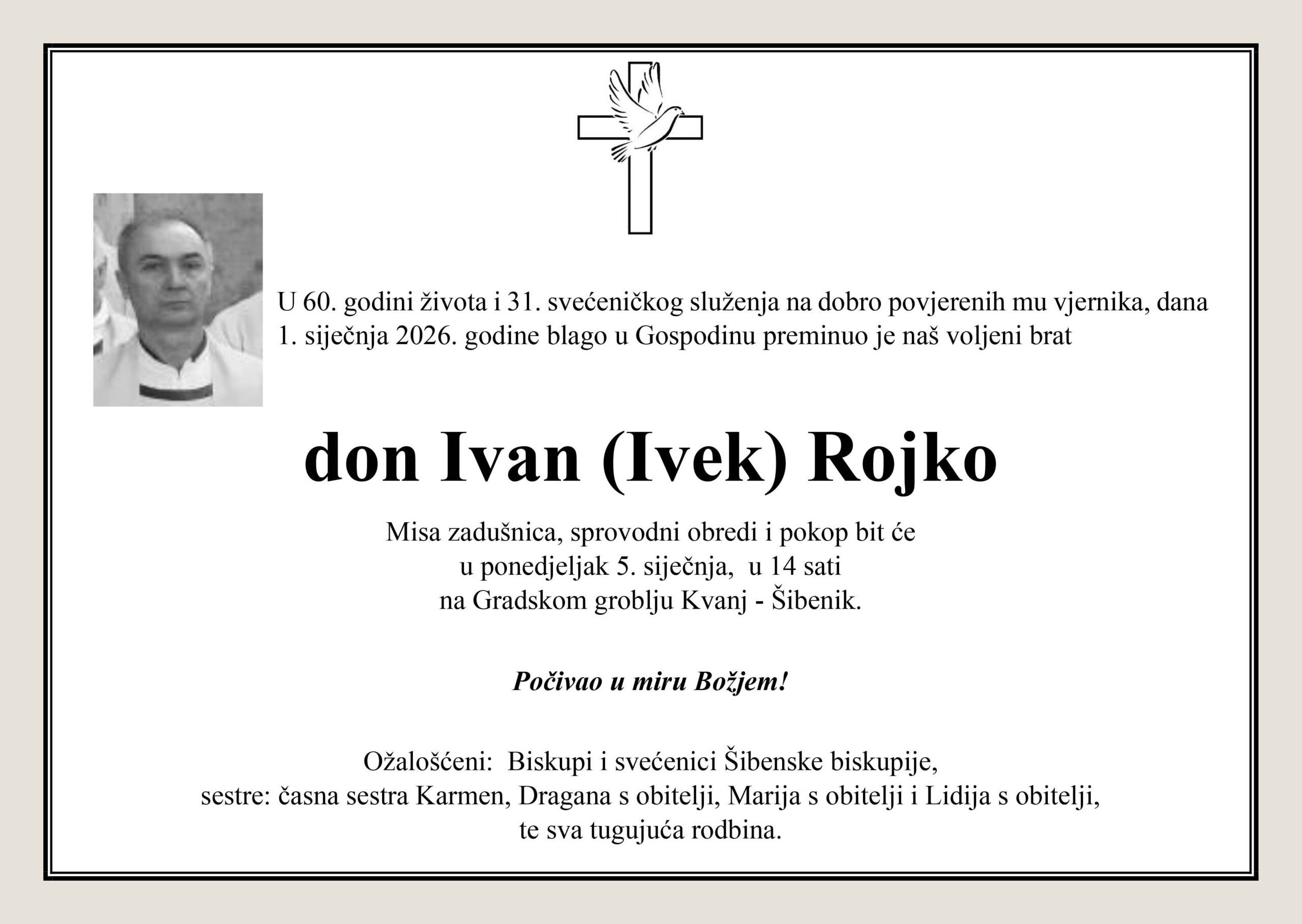 U 60. godini života i 31. godini svećeništva, na samu Novu godinu, 1. siječnja, preminuo je svećenik Šibenske biskupije don Ivan (Ivek) Rojko.